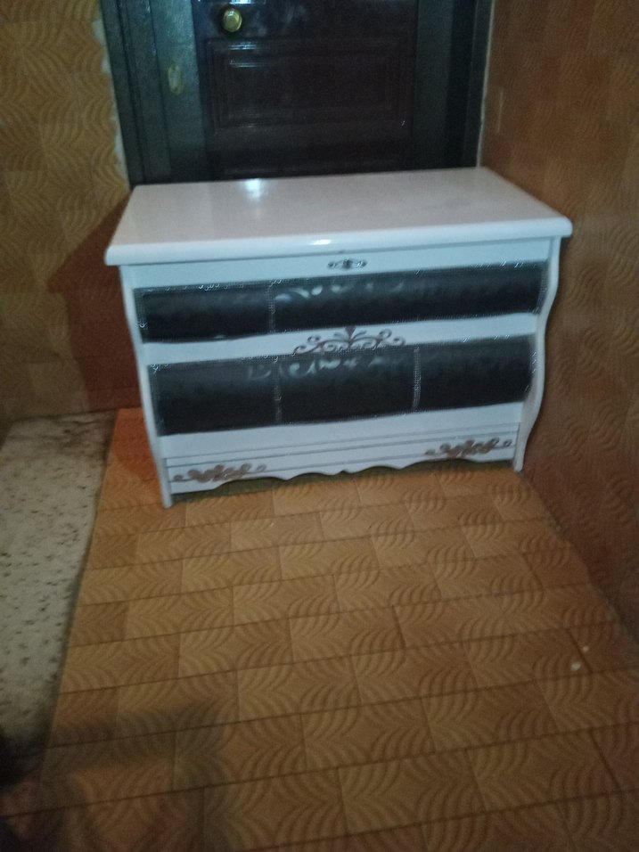 Beyaz çerçeveli, koyu renk ön panelli ve dekoratif detaylı çocuk şifonyeri, şık bir depolama sunar.