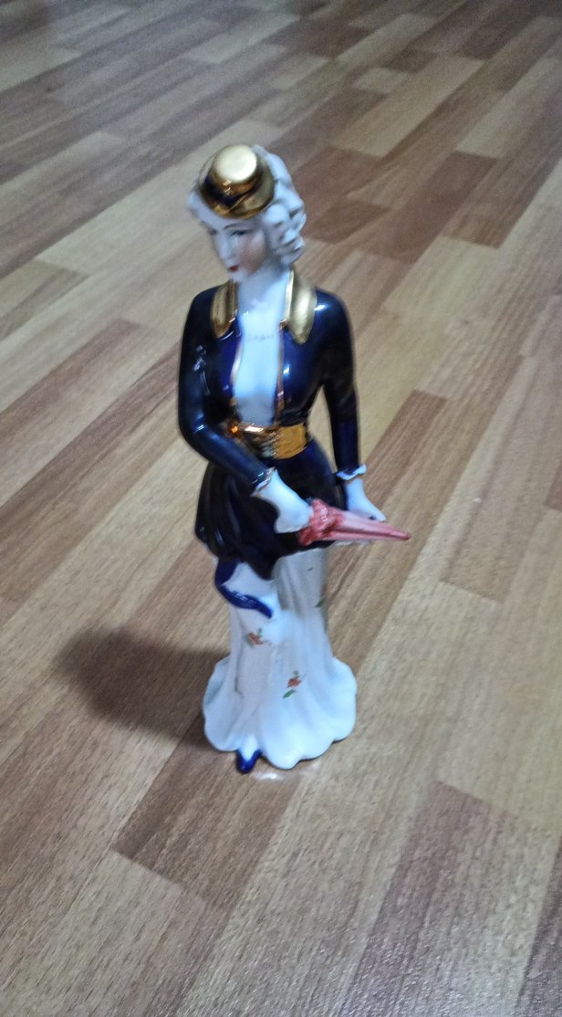Altın detaylı şapka ve yakaya sahip, pembe çant tutan beyaz ve koyu renkli kadın figürini. Detaylı bir taban üzerinde duruyor.