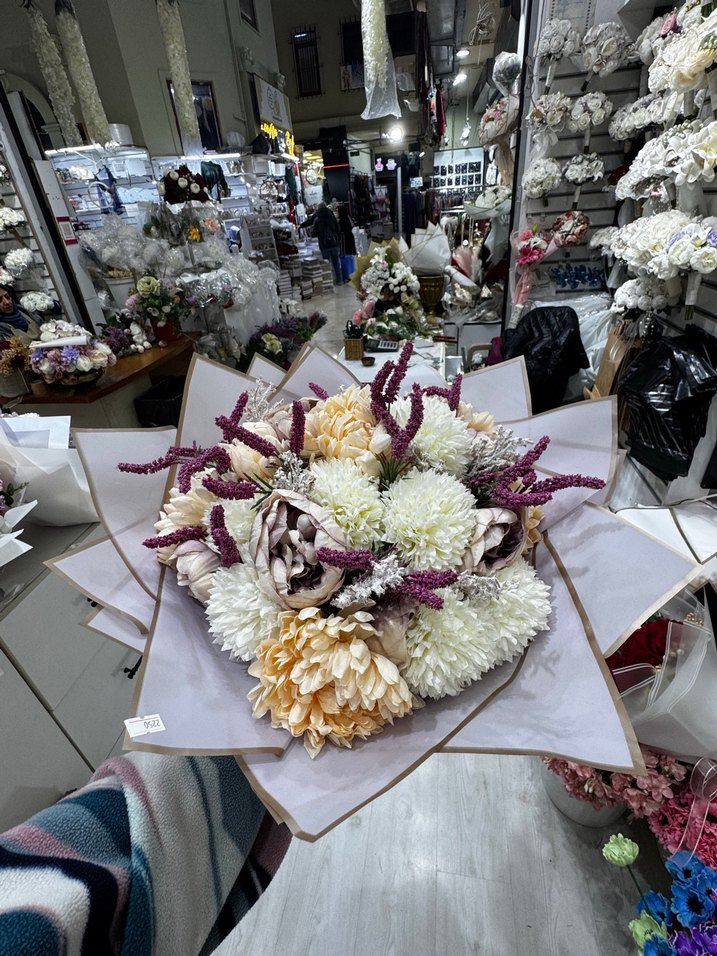 Beyaz ve krem renkli yapay çiçeklerin mor dallarla süslendiği, beyaz kağıda sarılı dekoratif buket. Ev dekorasyonu için uygun.