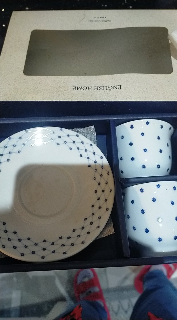 Beyaz porselen fincan ve tabağın üzerinde lacivert geometrik ve çiçek desenleri bulunur. Sıcak içecekler için uygundur. ☕