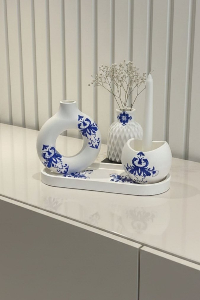Mavi çiçek desenli beyaz vazolar, modern tasarım ve şık taban ile dekoratif kullanım için uygundur.