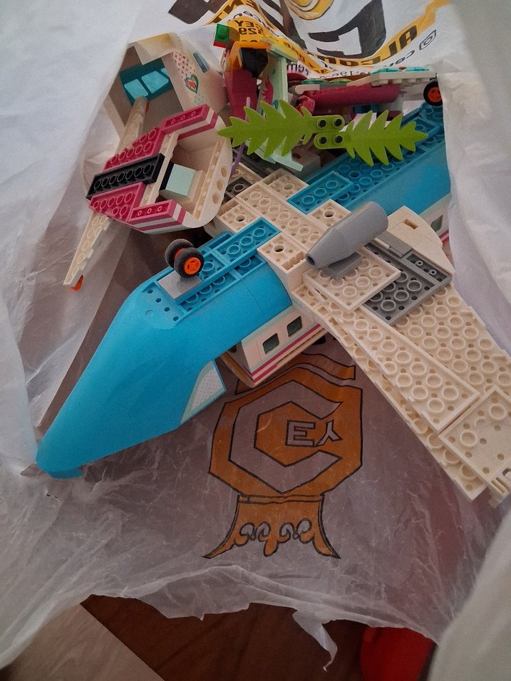 Beyaz ve mavi renklerde, kanatlar, tekerlekler ve yeşil yaprak parçaları içeren Lego uçak seti. #legofriends 41429 kitapçık, kutu, figürler mevcut