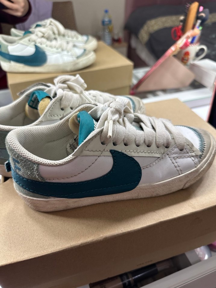 Beyaz ve mavi Nike sneakers, bağcıklı ve kauçuk tabanlı, spor görünüme uygun rahat sokak stili.