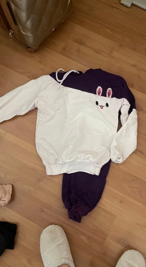 Yumuşak kumaştan, uzun kollu ve rahat kesim kız eşofman takımı. Beyaz ve koyu mor renklerde, baskılı tavşan deseniyle şık ve rahat.