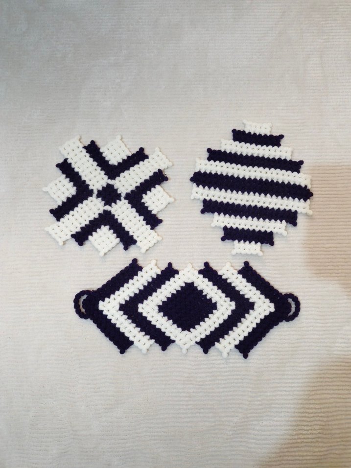 Beyaz ve mor geometrik desenlere sahip, 3 farklı şekilli banyo lif seti .