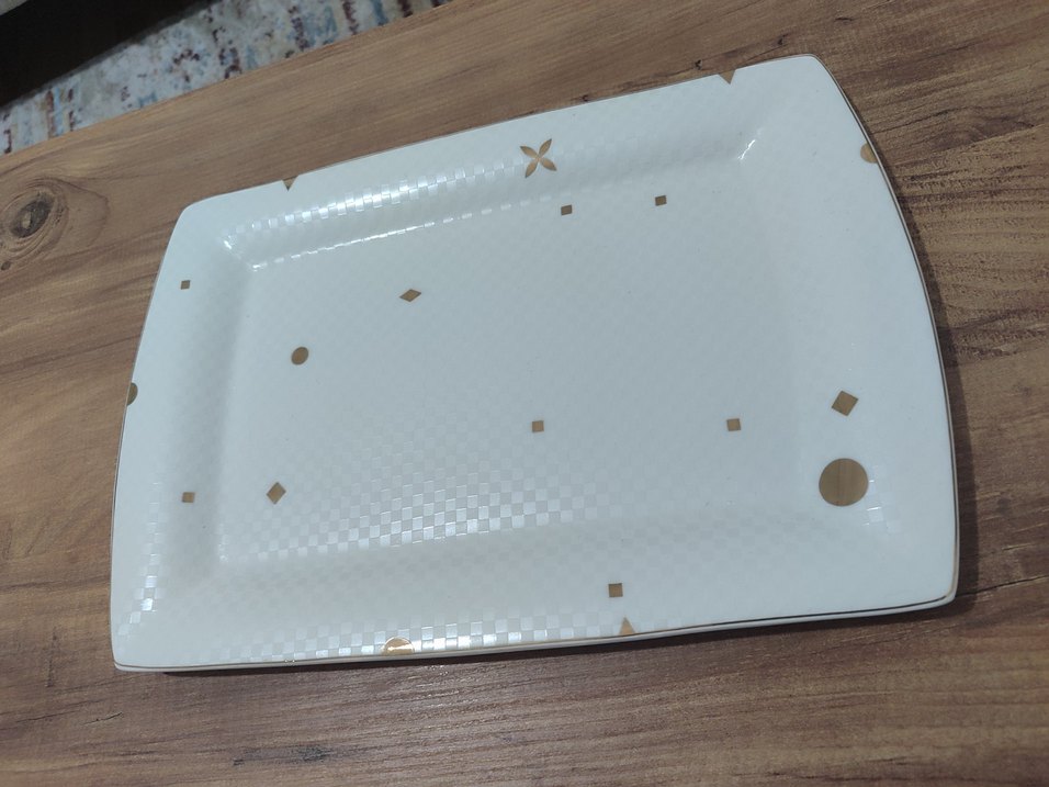Parlak beyaz yüzeye sahip, altın renkli geometrik desenlerle süslenmiş servis tabağı. ️