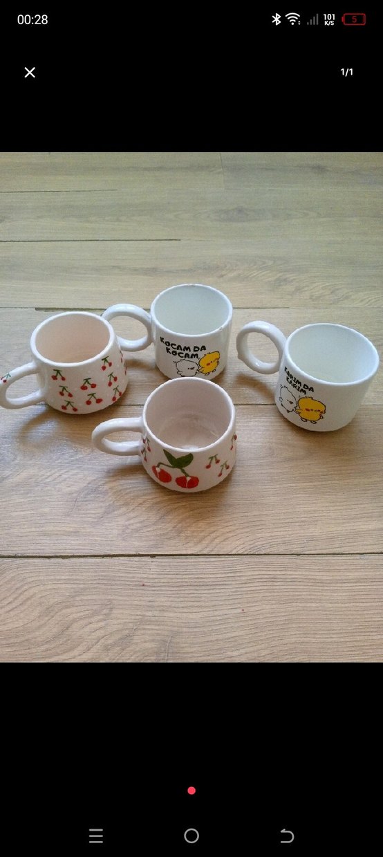 Pastel kiraz ve çizgi film figürlü beyaz seramik fincan seti, içecek servisine uygundur.