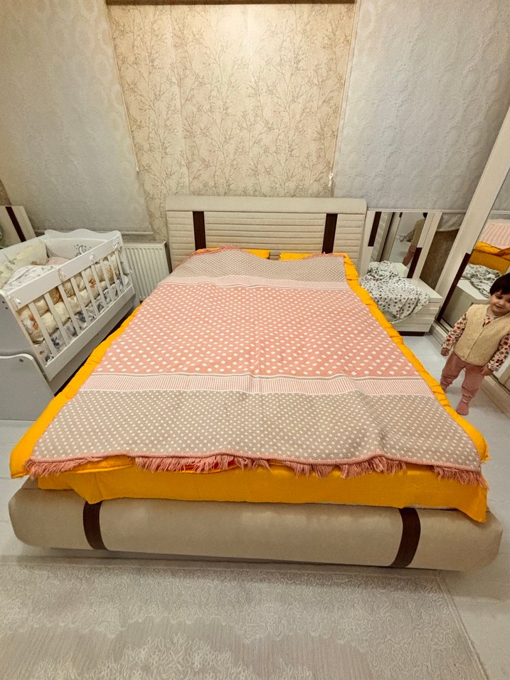 Pastel tonlarda beyaz kareli desenli, yumuşak kumaşlı ve ince püskül detaylı yatak örtüsü. Tek kişilik kalitelidir