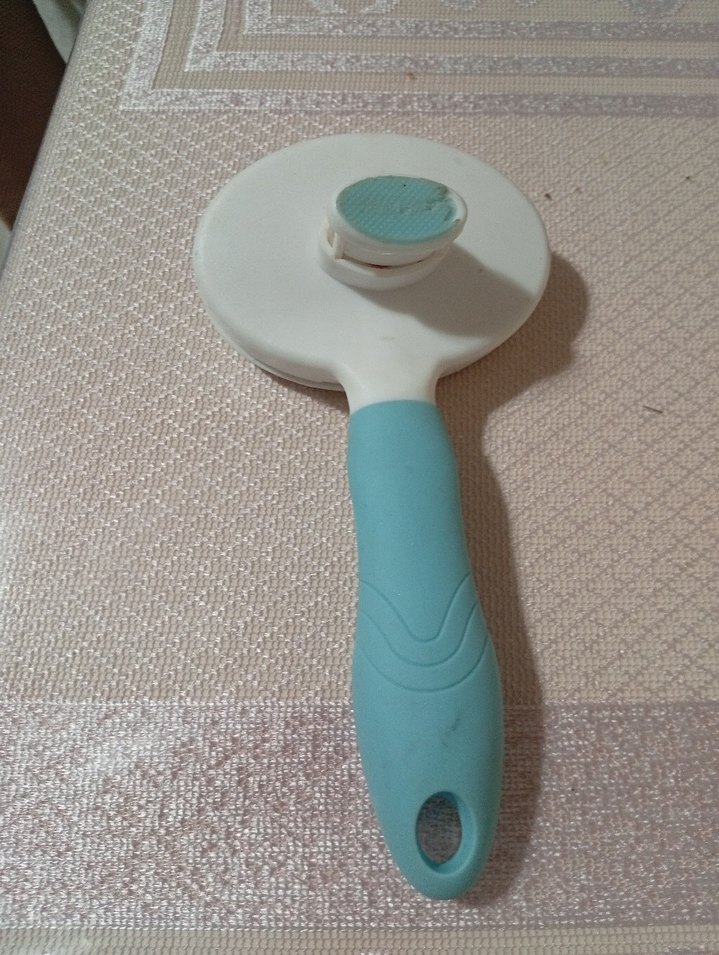 Pastel mavi saplı beyaz kedi tüyü toplama fırçası, kolay temizlik sağlar.
