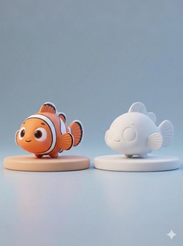 Pastel renkte ve beyaz renkte iki balık figürü, yuvarlak tabanlı.