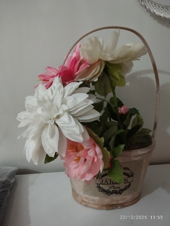 Beyaz ve pastel renklerde yapay çiçeklerin rustik bir sepette düzenlendiği dekoratif çiçek sepeti, ev dekoruna doğal bir dokunuş katıyor.