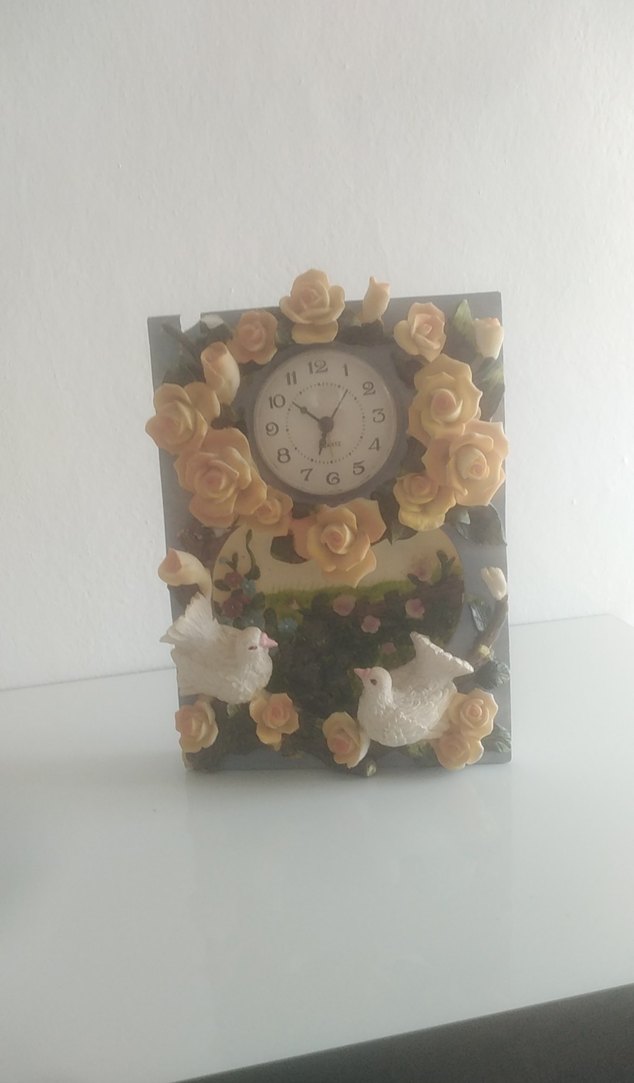 Beyaz ve pastel renkte, güller ve iki beyaz kuş figürüyle süslenmiş masa saati. ️