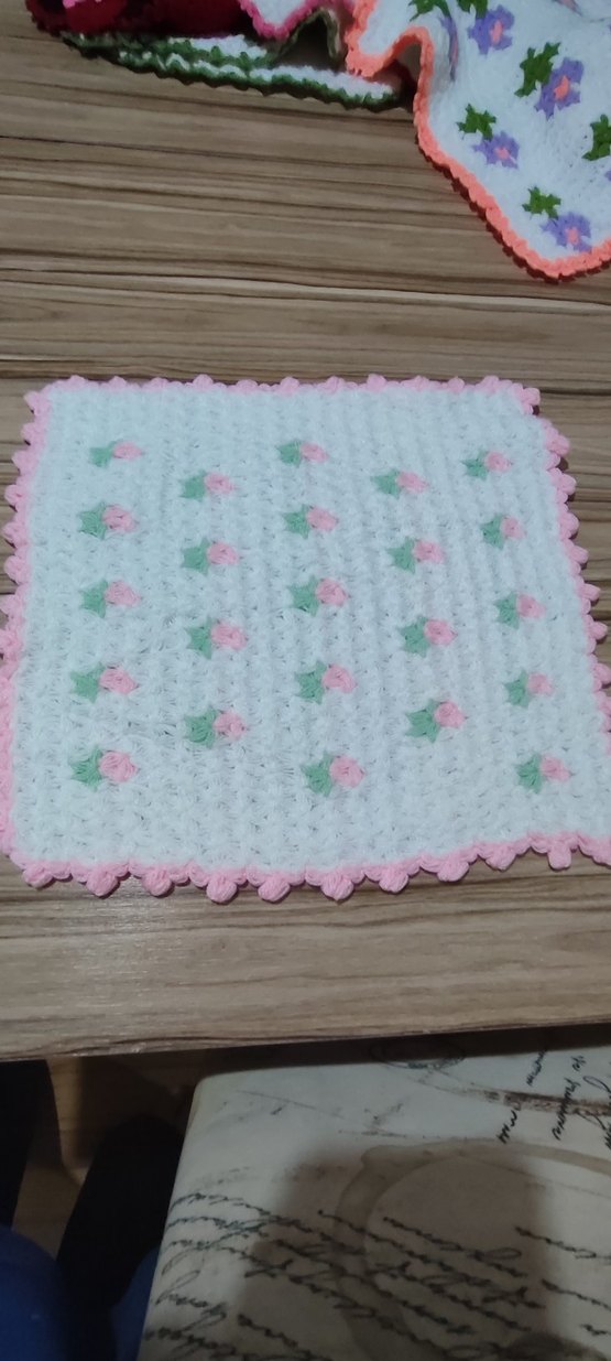 Beyaz ve pastel pembe-yeşil çiçek detaylı, yumuşak dokulu el örgüsü banyo süngeri. marka temsilidir