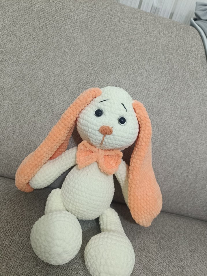 Beyaz renkte, pastel turuncu kulak ve papyon detaylı yumuşak peluş oyuncak tavşan. Dokulu ve rahat bir kumaşa sahip, sevimli ifadeli.