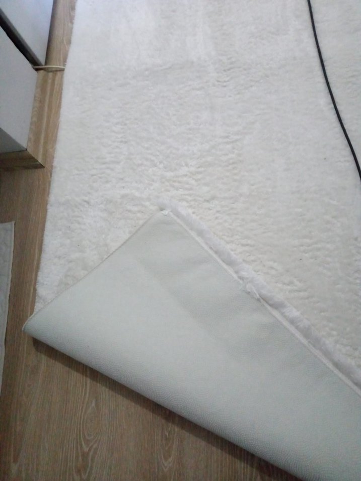 Yumuşak yüzeyli ve düzgün arka yüzeye sahip beyaz ve pelus hali, koruma ve rahatlık sunar. ️