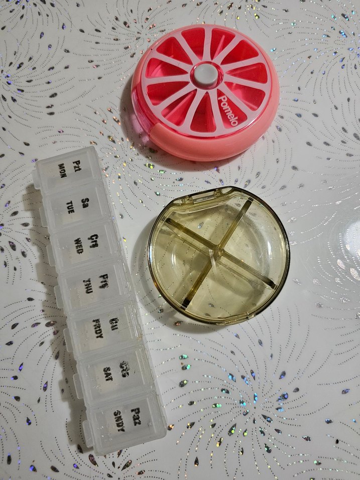 Adet fiyat Haftalık beyaz bölmeli kutu, pembe çok bölmeli yuvarlak kutu ve üç bölmeli şeffaf kutu seti. Küçük eşyaları düzenlemek için uygundur.