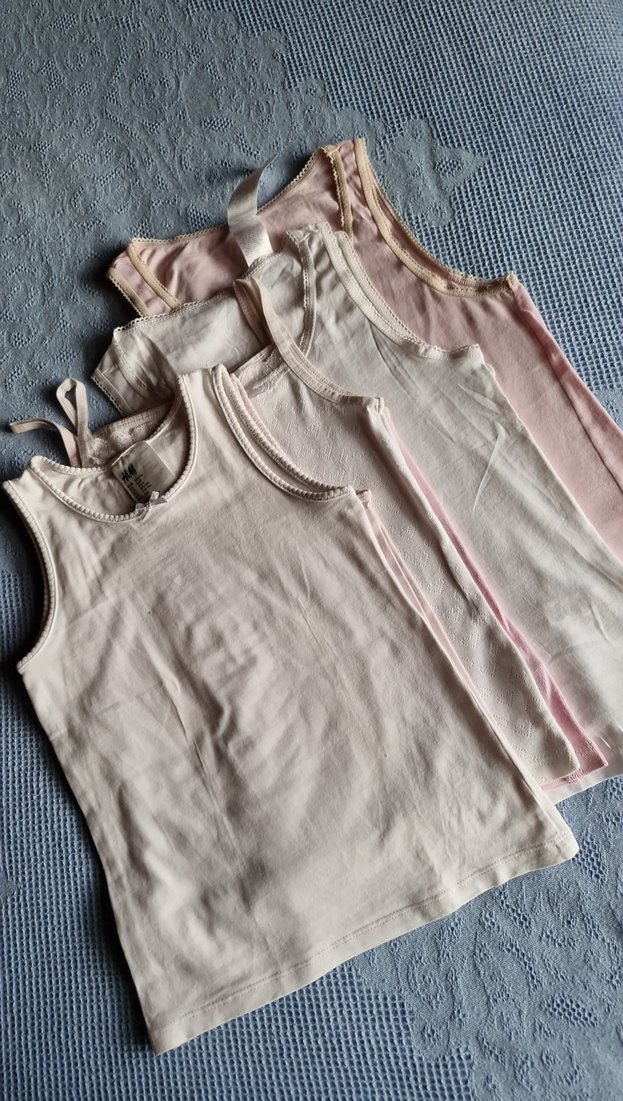 4vafet beyaz ve pembe ikililer, bir takim H&M, digeri LCW. yirtik sokuk yok. Yumuşak kumaştan yapılmış, beyaz ve pastel tonlarda çocuklar için kolsuz atlet seti.