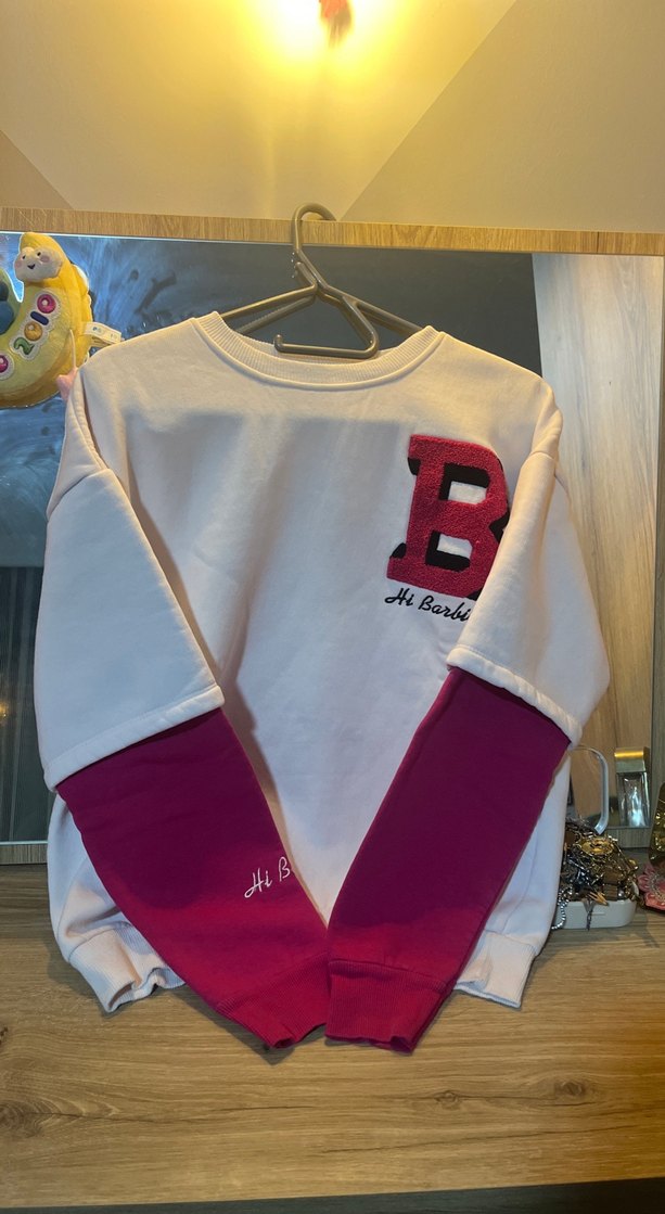 Beyaz ve pembe renklerde, bisiklet yaka ve uzun kollu, bol kesim kadın sweatshirt. 'Hi Barbi' yazılı baskı detaylarıyla günlük rahat kullanıma uygun, renkli ve şık bir model. 3 iplik şardonlu s m ve l uyumludur.