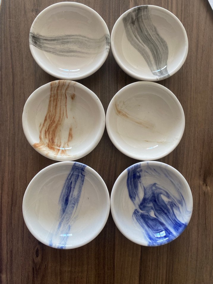 10 cm çaplarındadır. Bu set, gri, kahverengi ve mavi renkli çizgilerle süslenmiş beyaz yuvarlak tabaklardan oluşur. Her tabak benzersiz fırça darbesi desenine sahiptir. ️