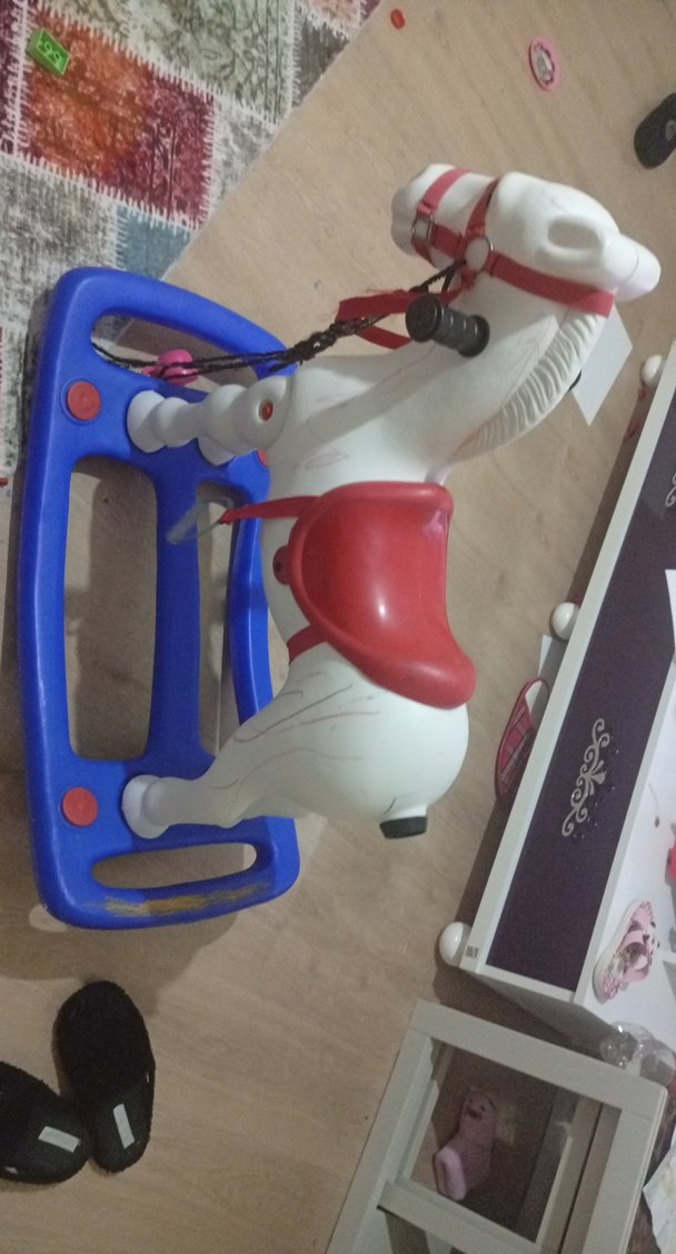 Bu renkli çocuk at oyuncağı beyaz gövde, kırmızı eyer ve mavi taban ile desteklenmiştir. çocuklar boyadı onun dışında hiçbir kırığı çatlağı yok sapasağlam