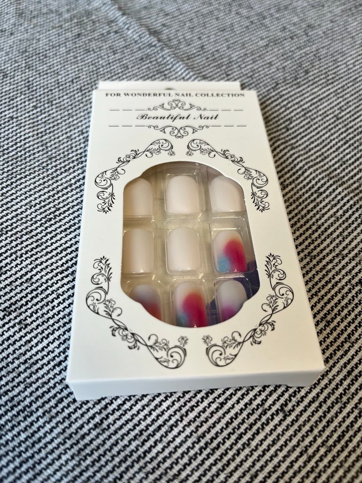Açık beyaz ve renkli desenlere sahip tırnak süsleri, kolay kullanım için paketlenmiş. Marka adı 'Beantifut' olarak görünüyor. 24 adet tırnak 24 adet yapıştırıcı bir adet törpü