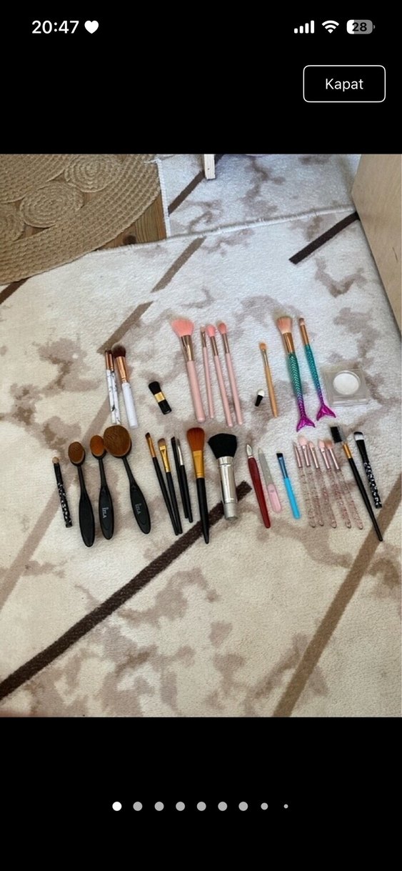 Çeşitli boy ve şekillerde, beyaz ve canlı renklerde makyaj fırçalarından oluşan set. ️