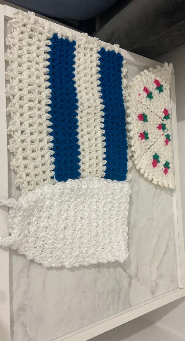 Beyaz taban üzerine renkli detaylarla örülmüş, yumuşak ve etkili temizlik sağlayan örgü banyo süngeri. El örgüsüdürler hiç kullanılmamıştır. 3lü fiyatıdır.