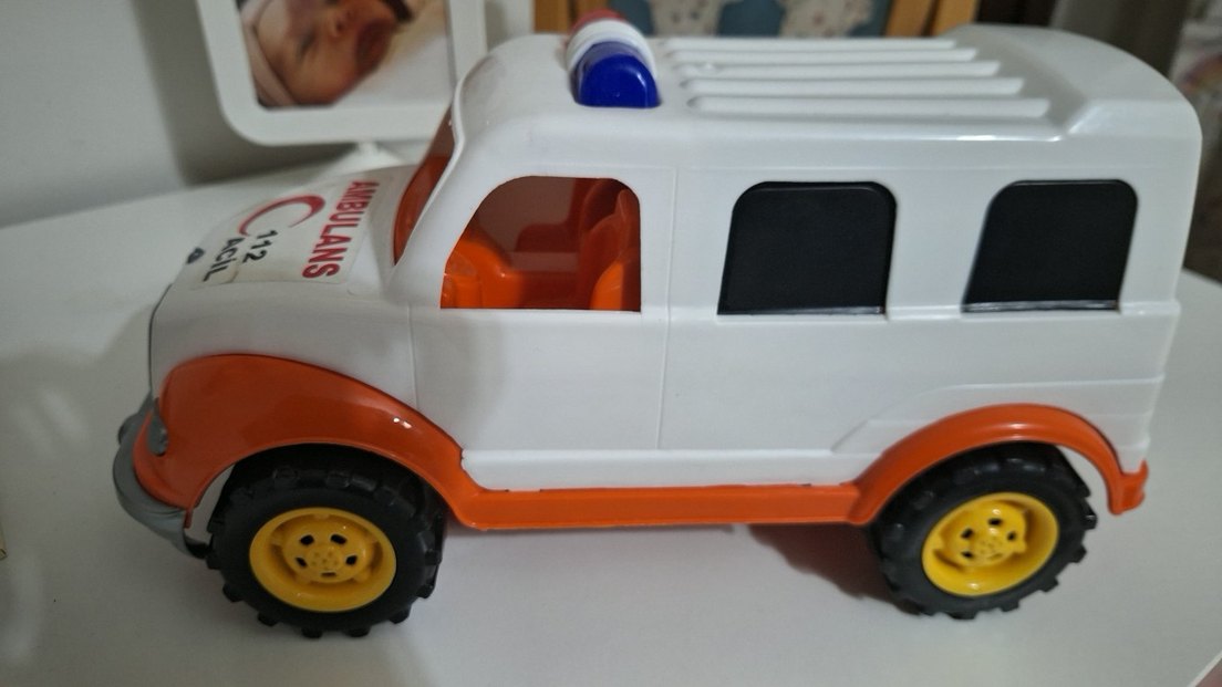 Bu oyuncak araba beyaz gövdeye, turuncu koltuklara ve üstte mavi ışığa sahiptir. Siyah tekerleklerde sarı detaylar bulunur.