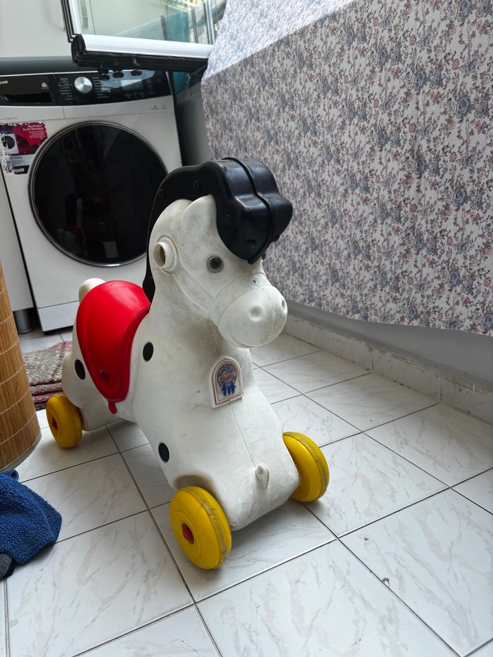 İhtiyacı olan birine vermek istiyorum fiyatta gene yardımcı olurum yoksa çöpe atacağım çünkü Samsun Beyaz renkli, kırmızı eyerli ve siyah yeleli bu oyuncak atın renkli tekerlekleri vardır. Çocukların binebileceği veya itebileceği şekilde tasarlanmıştır.