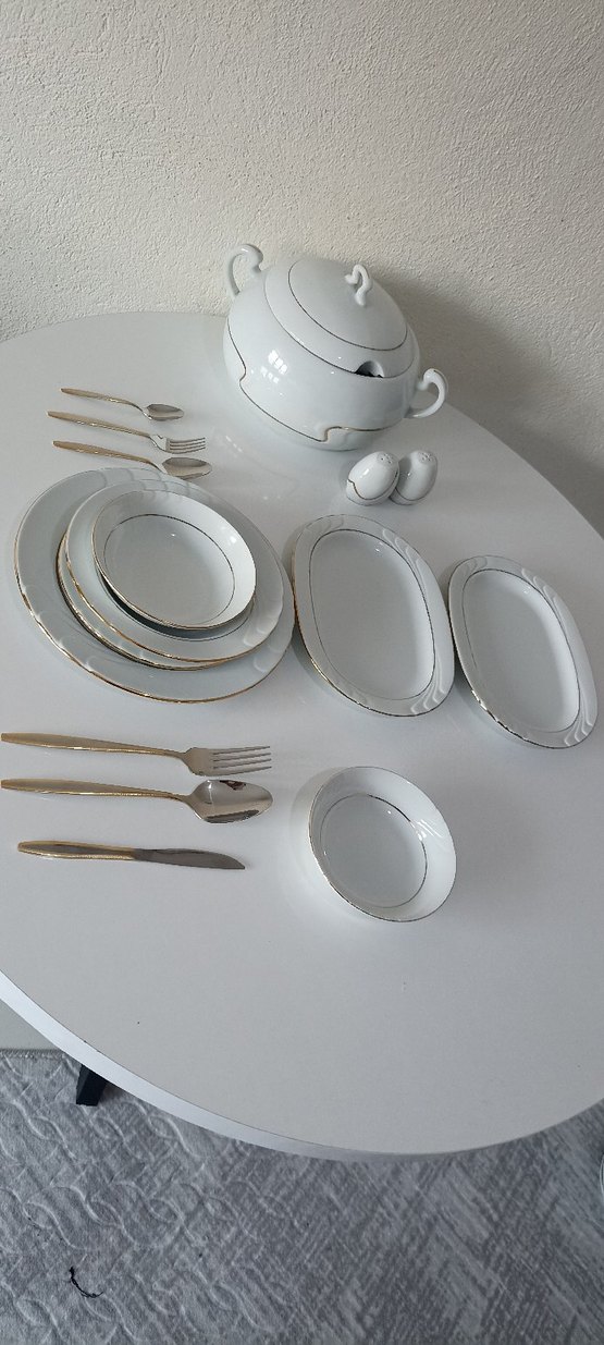 Beyaz ve gri desenli yemek takımı, tabaklar, kaseler, servis tabakları ve altın detaylı çatal, bıçak, kaşık içerir. ️