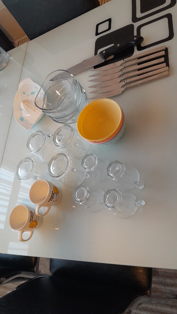 Beyaz ve şeffaf cam bardaklar, iki beyaz fincan ve sarı kase içeren set. Masada bıçaklar da yer alıyor. 1de limon sıkacağı ile toplu satis fiyatıdır. #mutfak #fincan #bıçak #kâse #limonsıkacağı