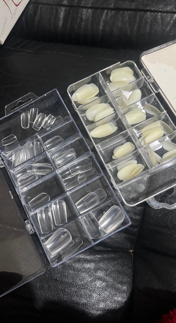 Farklı boyutlarda beyaz ve şeffaf yapay tırnaklar, plastik bölmeler içinde düzenli şekilde yer alıyor. Parlak ve pürüzsüz yüzeye sahip.