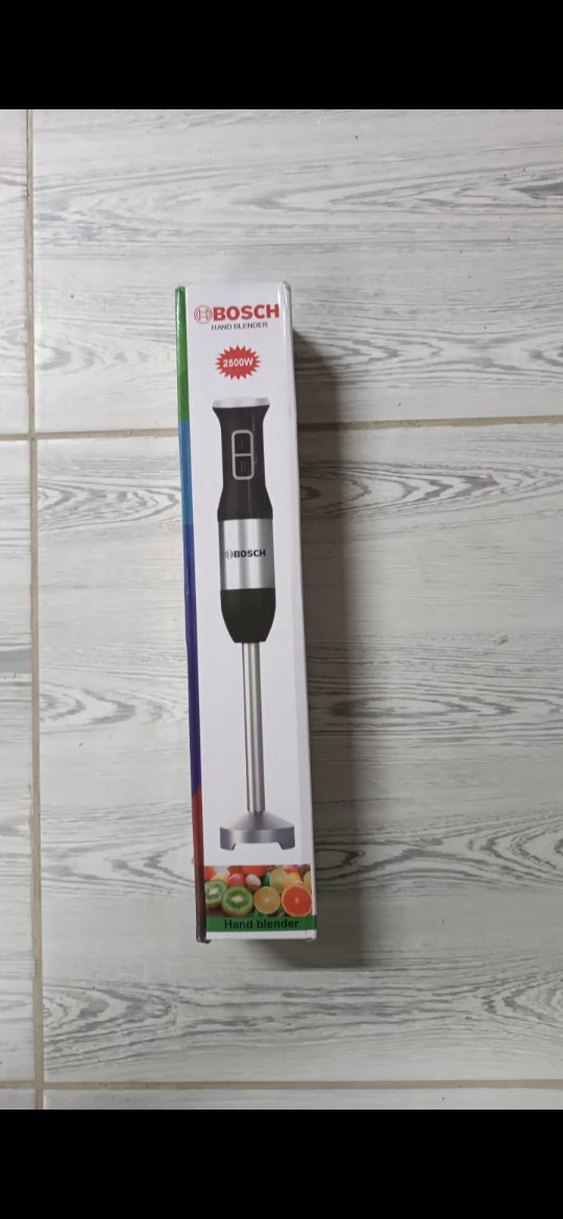 Beyaz ve siyah renkte, 2500W gücünde Bosch el blenderı, meyve ve sebzeleri karıştırmak için uygundur.