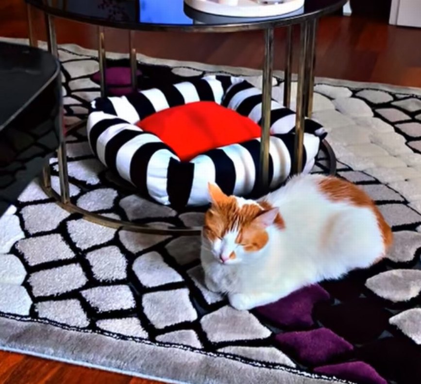 Beyaz ve siyah çizgili, kırmızı yastıklı kedi yatağı, kedim sevmediği için hiç kullanılamadı bir iki kez kullanmadı için deneyip kaldırdım