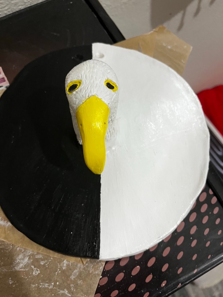 Beyaz ve siyah yuvarlak taban üzerinde sarı gagalı dekoratif kuş figürü. Kilden yapılmıştır