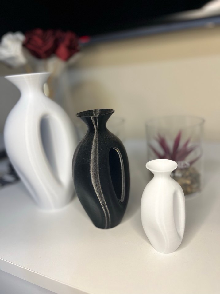 Beyaz ve koyu renklerde, modern tasarıma sahip dekoratif vazolar seti. Ev dekorasyonunu tamamlar.
