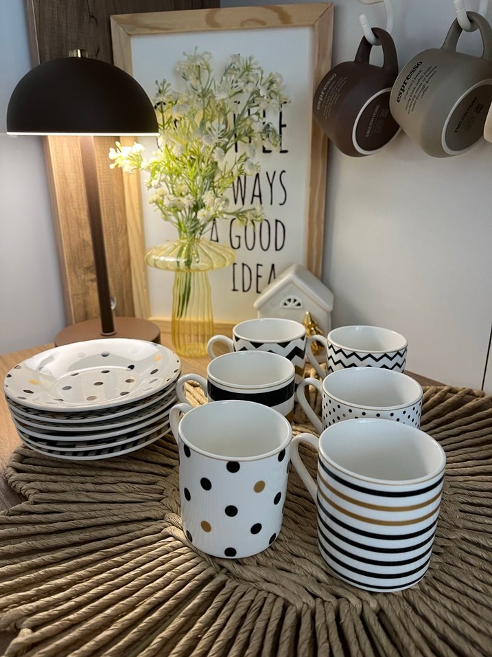 Beyaz porselen fincanlar, siyah ve altın renkli çizgi, nokta ve zikzak desenlerine sahip. Her fincanda kulp bulunur ve pürüzsüz bir yüzeye sahiptir. ☕