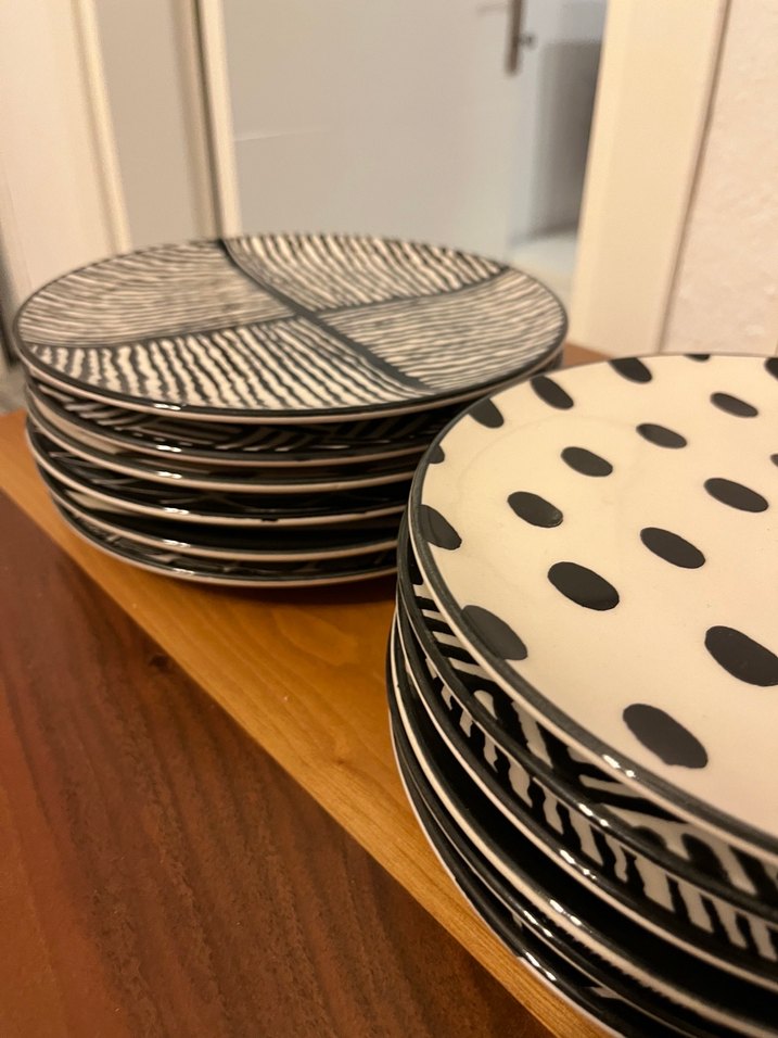 12 adet siyah desenli beyaz seramik tabak seti. Modern sunumlar için uygundur. Az kullanıldı defosu yoktur
