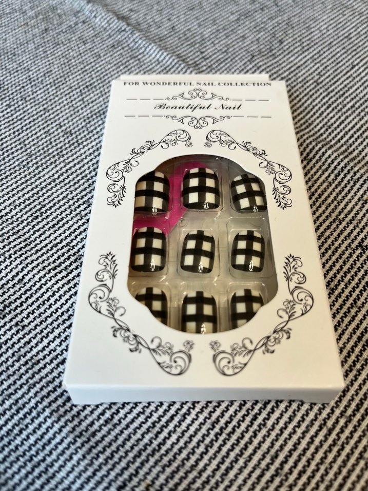 Beyaz zemin üzerine siyah ekose desenli tırnak süsü seti, tırnaklara dikkat çekici bir görünüm katar. 24 adet tırnak 24 adet yapıştırıcı bir adet törpü