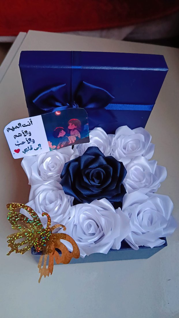 Koyu kutuda beyaz ve siyah güllerle hazırlanmış, kelebek ve küçük kartlı hediye seti.