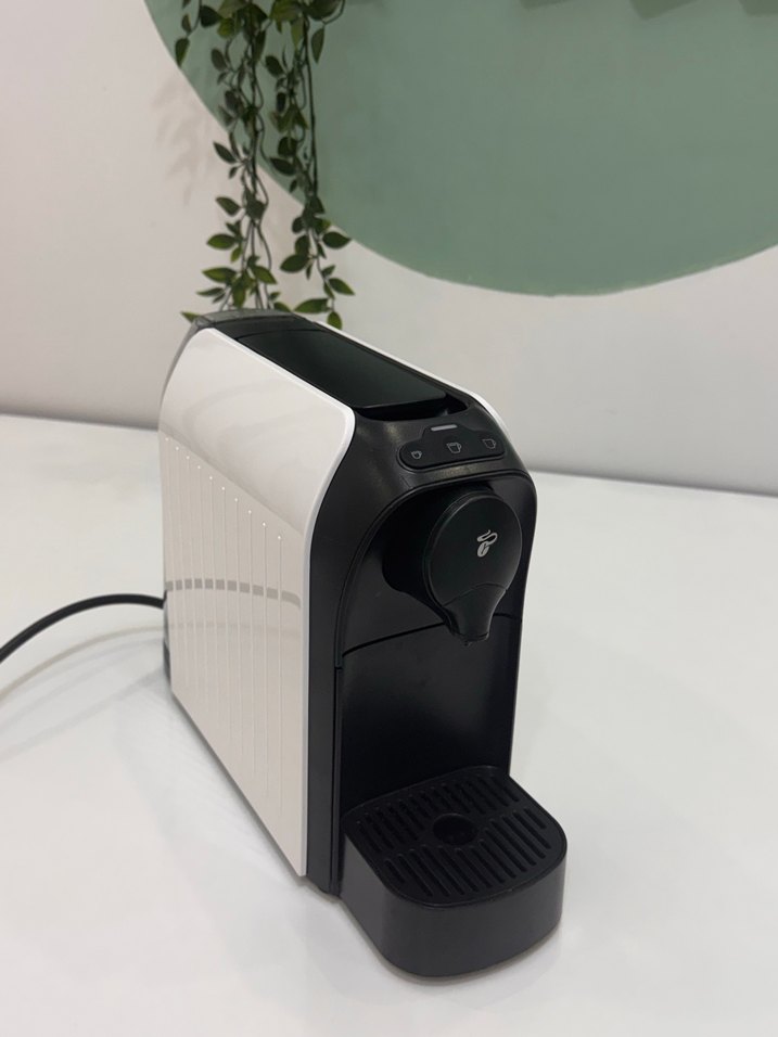 Kompakt tasarıma sahip kahve makinesi, siyah ön yüz ve beyaz yanlarla espresso veya kahve kapsülleri için uygundur. ☕