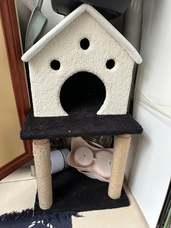 Beyaz ve siyah Kedi Evi ve Tırmalama Direği