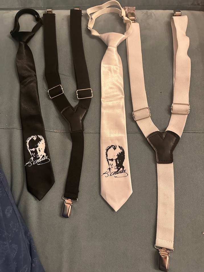Baskılı portre desenli siyah ve beyaz klasik erkek askıları ve kravatlar. Ayarlanabilir kayışlar ve metal klipsler içerir. Beyaz temiz siyah hiç kullanılmadı