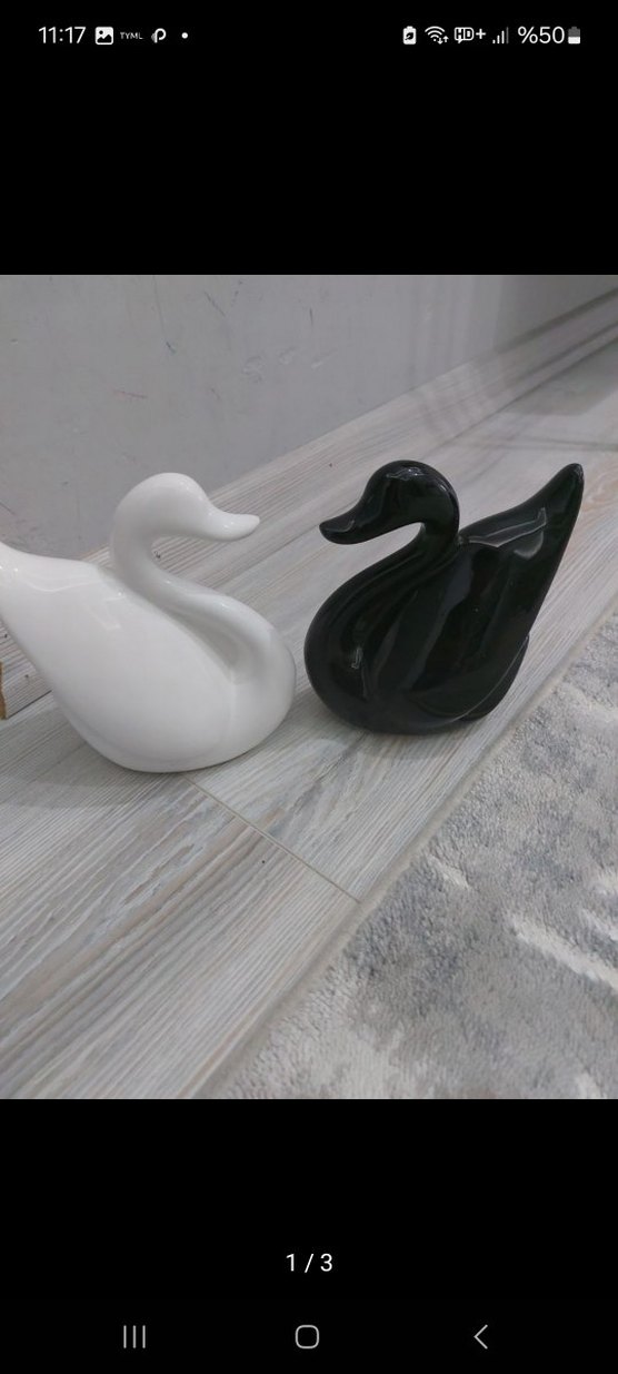 Beyaz ve siyah renklerde, pürüzsüz yüzeye sahip kuğu figürleri dekorasyon için uygundur.