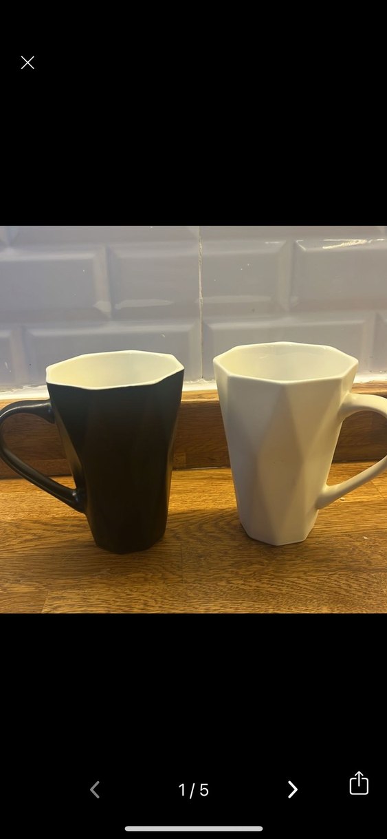 Beyaz ve siyah renklerde, fasetli tasarıma sahip s iki kupa, rahat tutma sapları ile.