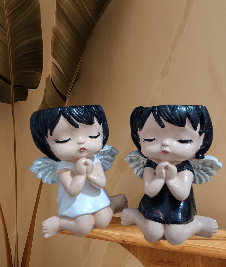 Küçük kanatlı, siyah saçlı ve elleri dua pozisyonunda beyaz ve siyah renkli iki melek biblo seti. Dekorasyon için uygundur.