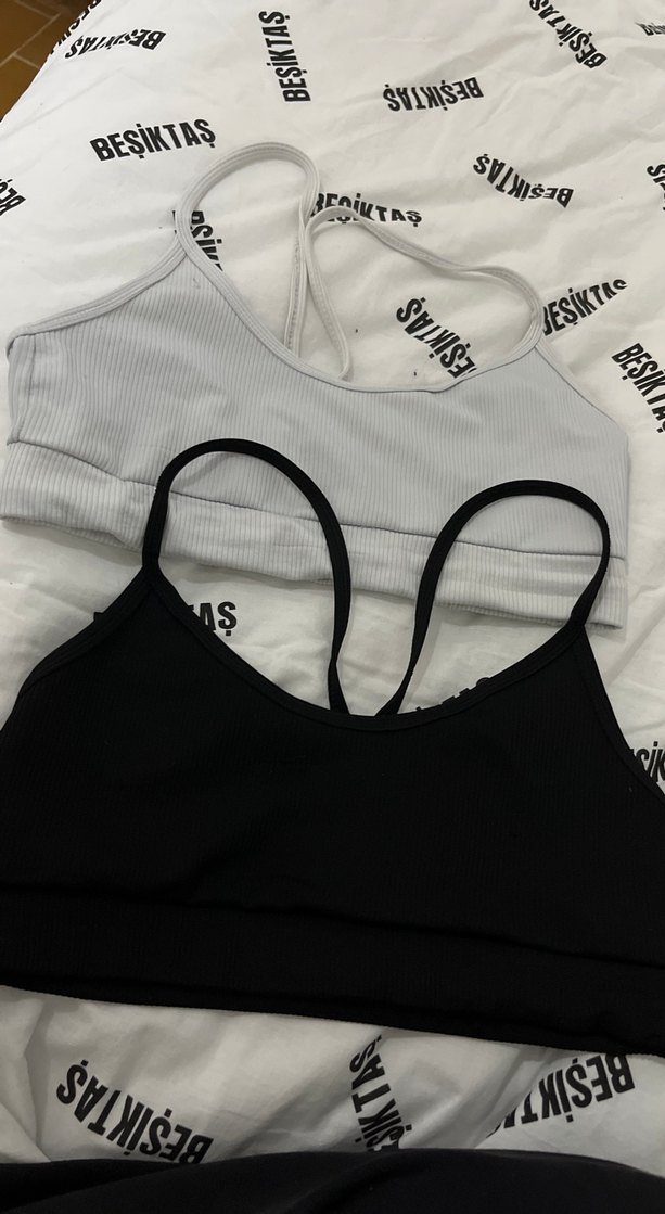 Beyaz ve siyah renklerde, ince askılı, desensiz mini spor sütyen seti. siyah olanın iç kısmında 1 adet kesik var süngerlerini cıkarmak için kesmiştim