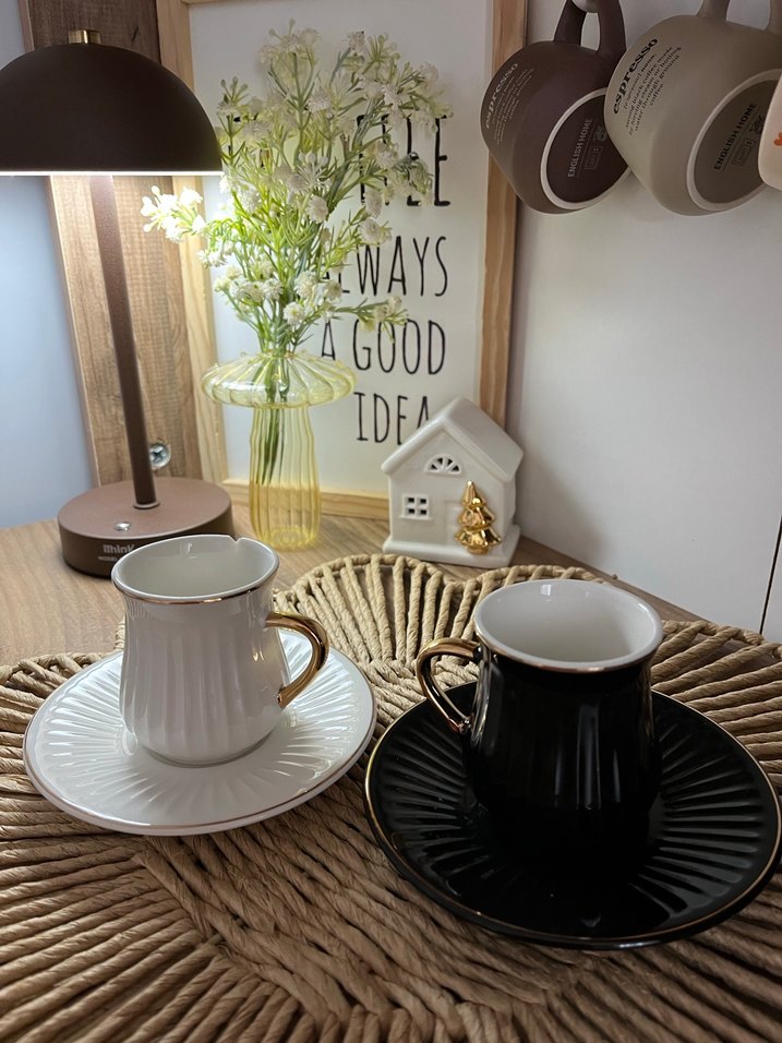 Altın detaylı kulplara sahip, beyaz ve siyah renklerde, kabartmalı desenli porselen fincan ve tabak seti. ☕ son fotoğrafta sadece beyaz fincanda kırık mevcut