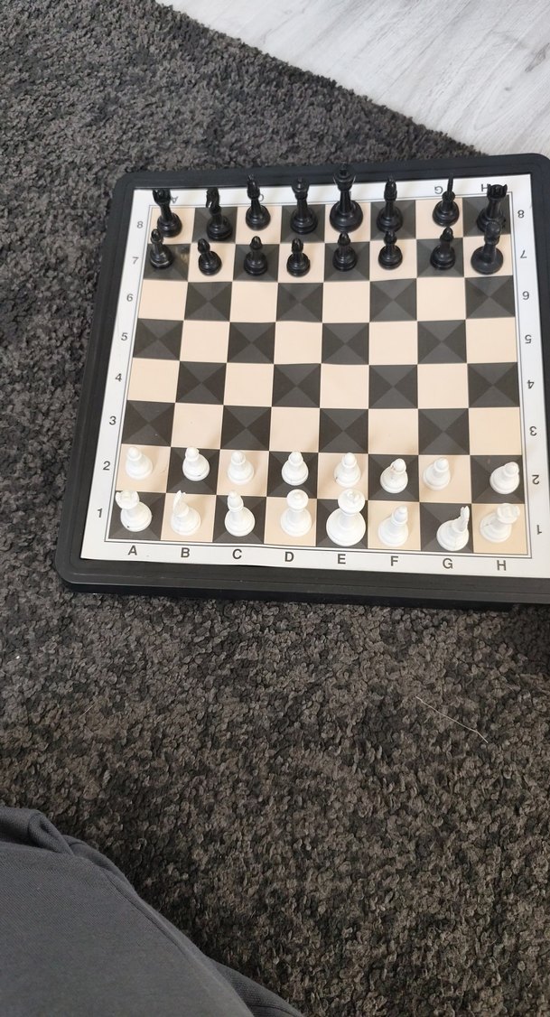 Kareli siyah beyaz satranç tahtası üzerinde tam set satranç taşları yer alıyor. Tahta kenarı siyah çerçeveli ve üzeri koordinatlı. ♟️