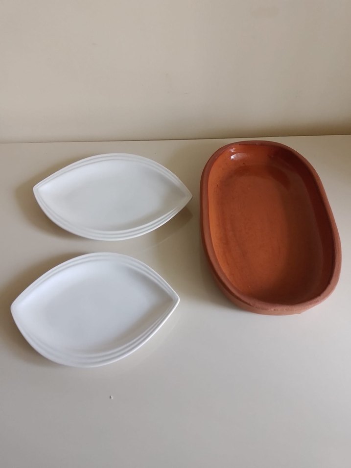 Set, yaprak şeklinde iki beyaz porselen tabak ve bir oval toprak tonlu güveç tabaktan oluşur, yemek servisi için uygundur.güveç tabak 15 cm porselen tabaklar 16 ve 13 cm dir porselen tabaklar tripod markadır